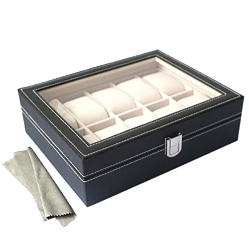 Description This brand new personalized watch display case with glass top, let collectors show their watches while keeping them protected against dust, fingerprints, and scratches. Plus, the elegant leather finish fits comfortably into any decor. Our 10-slot leather watch box adds timeless elegance and a personal touch to any collection make a great gift for any collector. What's the advantage of our watch case? ? High transparency and good surface hardness Glass Top, NOT those cheap and easy scratching Plastic Board. ? Extra long and soft velvet fabrics for case lining and pillows, NOT those hard and paper like hand touching products. Features ? Black PU Leather ? Fashionable contrasting color stitches along the edges ? Large clear glass for peering and protecting against dust ? 10 slots w removable pillows, holds up to 10 watches or other jewelry ? Lined in extra soft faux suede that protect your watches better. Dimensions Overall 10-1/8"L x 8-1/16"W x 3-1/4"H Clear View Area 7-1/2"L x 5-1/2"W Pillow 2-13/16"L x 1-13/16"H Slot 3-7/16"L x 1-11/16"W x 1-1/2"H Package Contents ? 1x Watch Display Case with glass top and lock ? 10x Removable Pillows ? 1x Watch Polish Cloth(Gift)