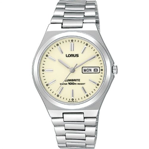 Stylish Lorus model in stainless steel, featuring an elegant cream dial with silver baton hour markers, day and date functions, and slender hands.