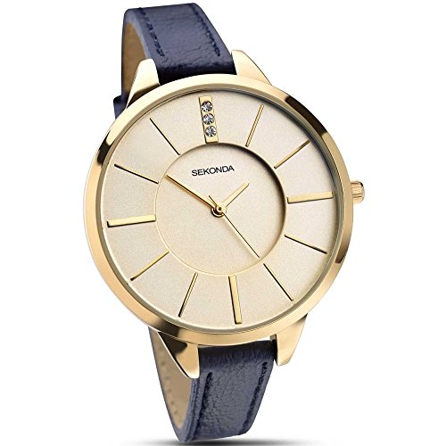 Stunning ladies Sekonda Editions watch features a chic sandy coloured stone set dial and an elegant gold-plated case with a slim navy blue leather strap finish.