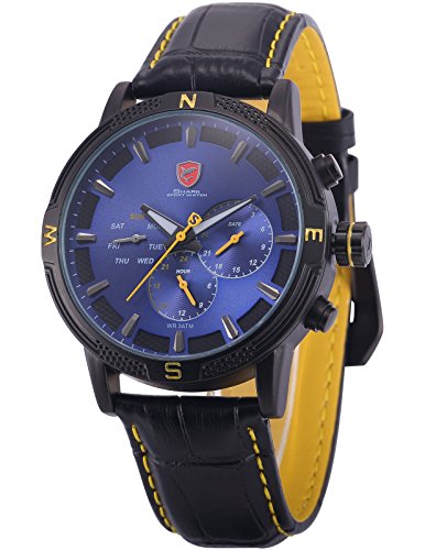 Best Seller! Shark Mens SH346 Quartz Blue Dial Day/ Date/ Dual Time Zone Leather Wrist Watch Black/Yellow Review